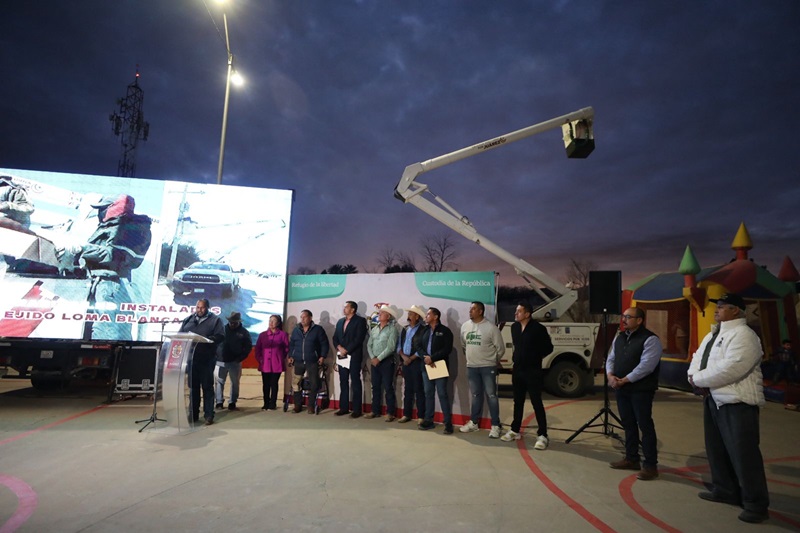 Ciudad Juarez, Chihuahua – Esta tarde el Presidente Municipal, Cruz Pérez Cuéllar hizo entrega de los trabajos de iluminación en el ejido Loma Blanca, los cuales constan de la instalación de 622 lámparas de tecnología led, la rehabilitación con pintura de la cancha del poblado y la limpieza de la carretera Juárez Porvenir.