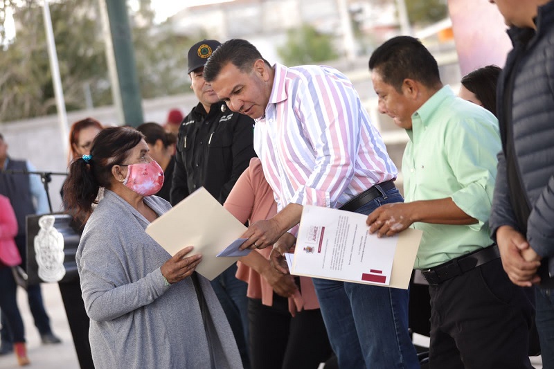 De manera simbólica se entregaron las cartas de posesión y planos catastrales a María Guadalupe Escobedo Santos, Nancy González Martínez, Jorge Luis Uribe Aguirre, Leticia Hernández Pérez y Silvia Verónica Molina Luna.