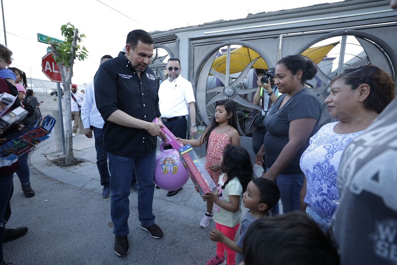 Ciudad Juárez, Chihuahua – El Presidente Municipal, Cruz Pérez Cuéllar, acompañado de su esposa y titular del DIF, Rubí Enríquez, encabezó la entrega de juguetes y apoyos alimenticios a las familias de Praderas de los Oasis.