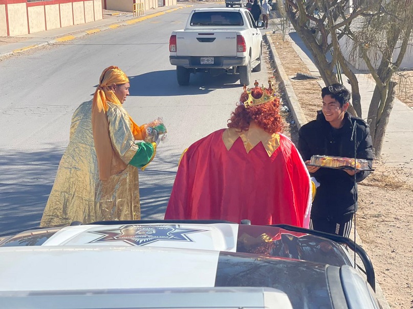 Caracterizados de los tres Reyes Magos, Santa Claus y personajes infantiles, los agentes de la corporación recorrieron las calles del suroriente de la ciudad para atender la instrucción del Secretario de Seguridad Pública Municipal, César Omar Muñoz Morales y entregar 300 roscas y 500 bolos.