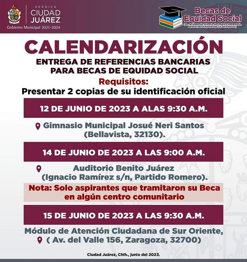 Ciudad Juárez, Chihuahua – La Dirección de Educación Municipal anunció que el próximo lunes dará inicio la segunda entrega de referencias bancarias, por lo que se pide a los padres de familia que tramitaron con anticipación las becas escolares, acudir a las sedes donde les indica la plataforma digital.