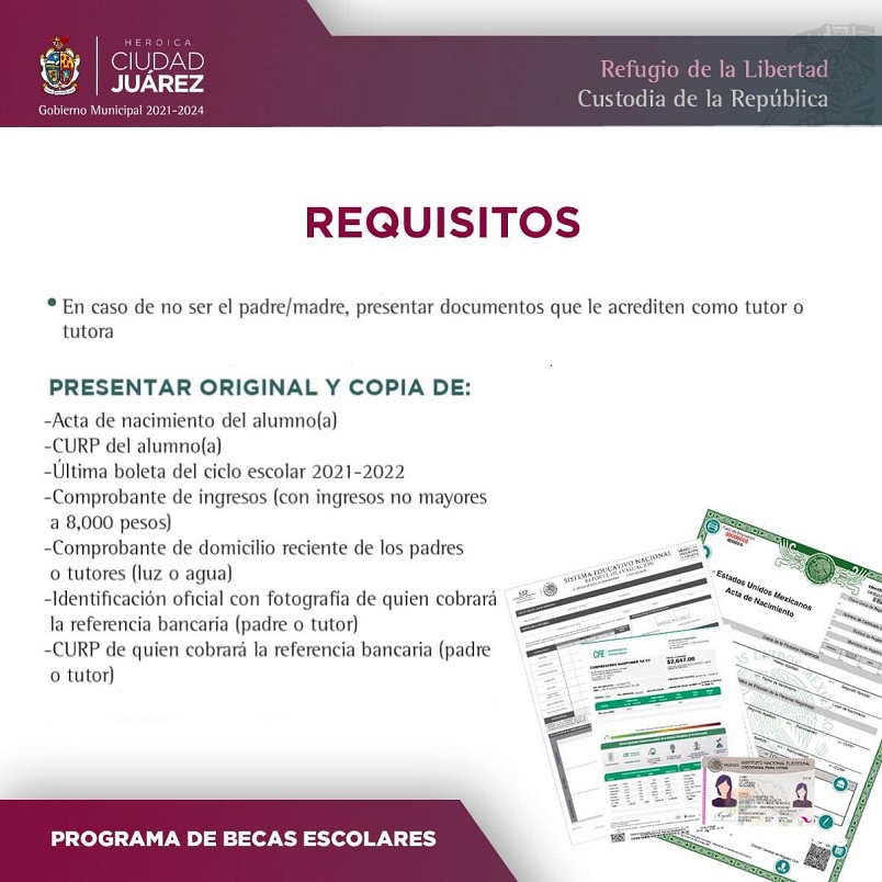 Indicó que cada referencia bancaria es equivalente a mil 500 pesos, y los requisitos para obtenerla es que el alumno tenga un promedio mínimo de 8.0 en el periodo escolar 2021-2022, ser ciudadano mexicano residente en el Municipio de Juárez, estudiar el nivel básico desde tercero de preescolar hasta media superior en escuelas públicas.