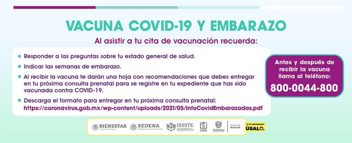 Se recuerda que las mujeres embarazadas que buscan recibir la vacuna contra COVID-19 deberán estar de la novena semana de gestación en adelante.