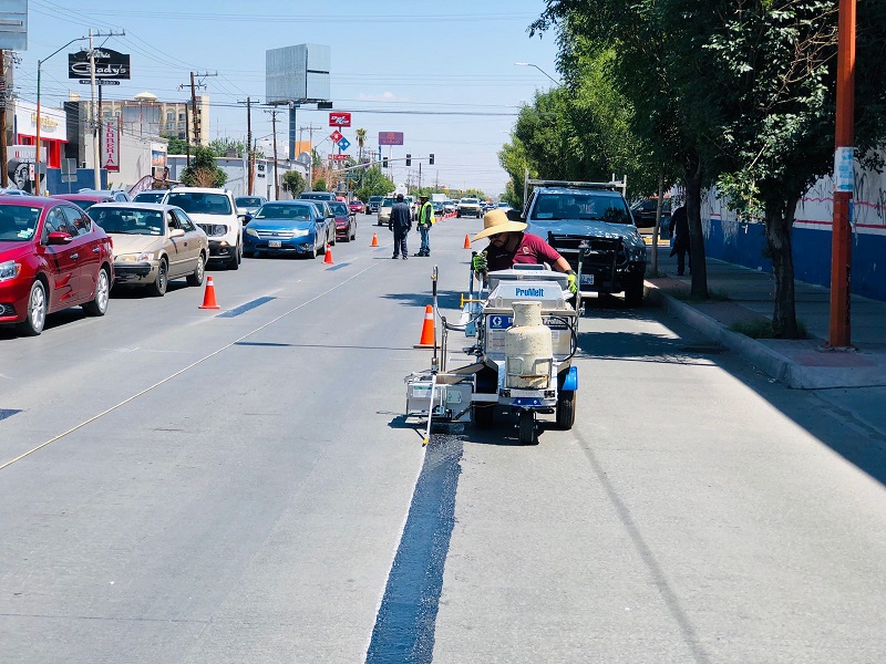 Ciudad Juárez, Chihuahua – La Coordinación General de Seguridad Vial exhorta a los conductores y peatones a respetar los trabajos de pinta de raya en las avenidas de la ciudad, toda vez que se están aprovechando los momentos del día en donde menos circulación vehicular se tiene para llevar a cabo estas labores.