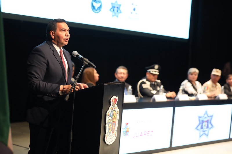 En su discurso, el alcalde Pérez Cuéllar pidió a los nuevos elementos proteger a las familias juarenses, pero especialmente al tesoro más grande de Juárez, la niñez y juventud.