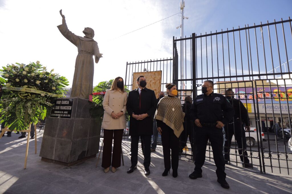 Dentro del mismo marco, colocaron una ofrenda floral en la estatua de Fray García de San Francisco ubicada en la Misión de Guadalupe.