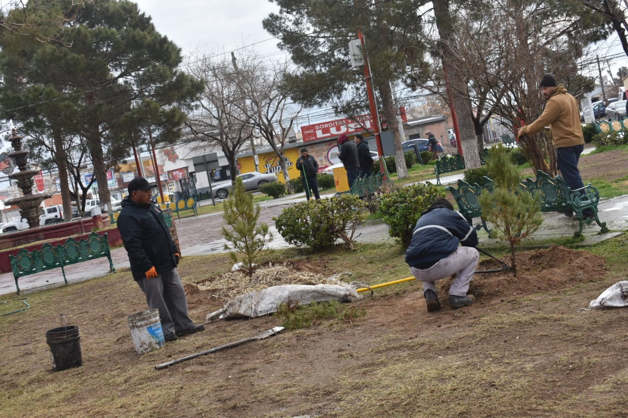 Ciudad Juarez, Chihuahua – Personal de la Dirección de Parques y Jardines trabaja en el mantenimiento y reforestación de la Plaza San Lorenzo, ubicada en el cruce de las avenidas Valle de Juárez y Tecnológico, informó Daniel Iván Zamarrón Saldaña, titular de la dependencia.