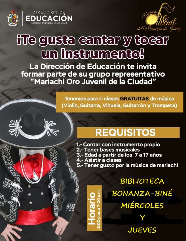 Ciudad Juárez, Chihuahua.- El Gobierno Municipal a través de la Dirección de Educación Municipal, invita a los niños y jóvenes a ser parte del grupo representativo “Mariachi Oro Juvenil de la Ciudad”.