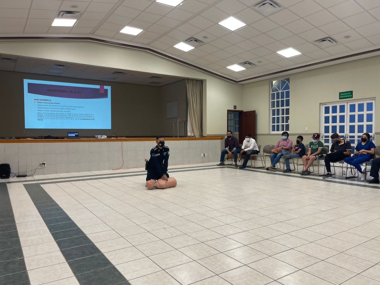 Los agentes preventivos apoyados con la caja torácica de un maniquí, les mostraron y explicaron a cada uno de los presentes los pasos de la reanimación cardiopulmonar (RCP), con la intención de que, si en algún momento se ven en la necesidad de dar primeros auxilios a otra persona, tengan conocimiento de cómo llevarlo a cabo.
