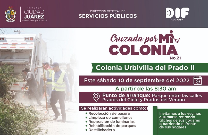 Ciudad Juárez, Chihuahua – En avance a las labores para la siguiente Cruzada por Mi Colonia, personal de la Dirección General de Servicios Públicos inició este jueves con trabajos previos para atender la colonia Urvibilla del Prado II, en donde el equipo de Limpia y Parques y Jardines ya trabajan en la limpieza.