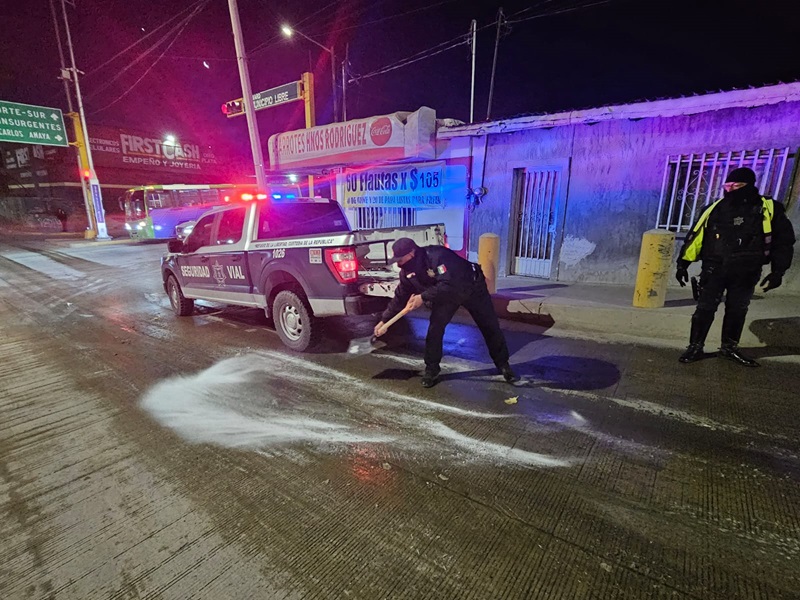 Ciudad Juarez, Chihuahua – Desde la madrugada de este lunes, agentes de la Coordinación General de Seguridad iniciaron con el esparcimiento de sal y arena en diferentes vialidades, debido al congelamiento de la carpeta asfáltica que presentaron diversas calles ante la caída de aguanieve y las bajas temperaturas.