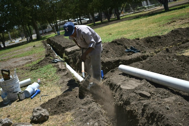 Ciudad Juárez, Chihuahua – La Dirección de Parques y Jardines trabaja en la instalación de sistema de riego por aspersión en el pozo tres del parque El Chamizal, con el apoyo de la maquinaria que el Presidente Municipal, Cruz Pérez Cuéllar, entregó recientemente.