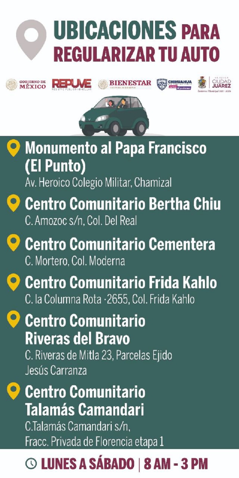 Ciudad Juárez, Chihuahua – A partir del próximo jueves 14, el Gobierno Municipal instalará un módulo con cinco carriles en el lugar conocido como “El Punto”, para agilizar la importación de vehículos de procedencia extranjera, ya que el decreto respectivo culminará el próximo 20 de septiembre, dio a conocer Hugo Alberto Vallejo Quintana, titular de la Dirección de Atención Ciudadana.