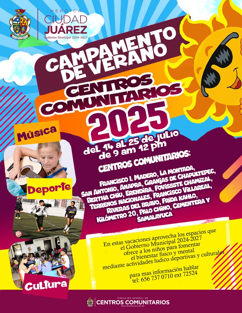 Ciudad Juarez, Chihuahua – El Gobierno Municipal, a través de la Dirección General de Centros Comunitarios, invita a las familias a inscribir a sus hijos en el Campamento de Verano 2025.