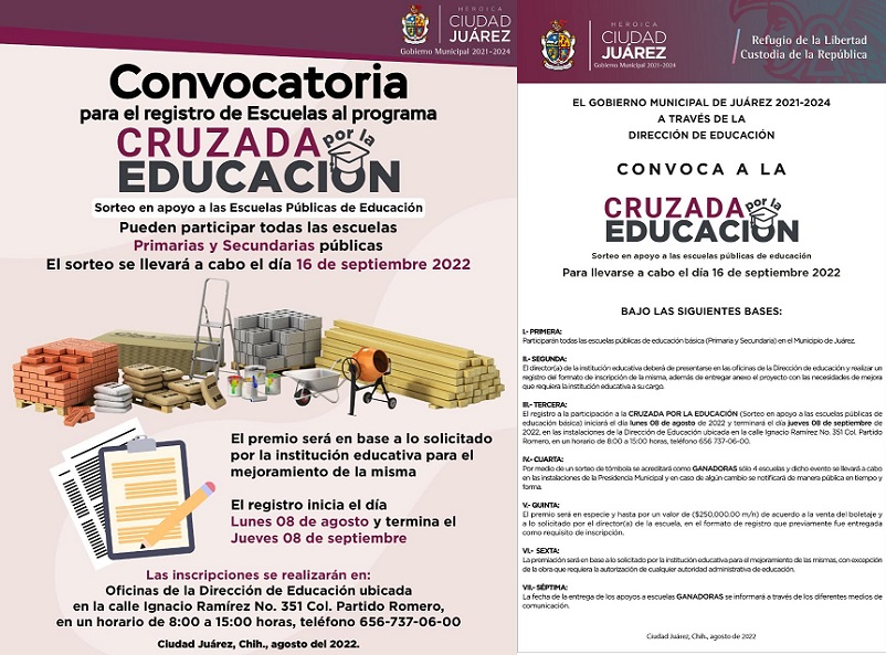 Ciudad Juárez, Chihuahua – La Dirección de Educación del Gobierno Municipal invita a las escuelas primarias y secundarias públicas a registrarse al programa Cruzada por la Educación, que tiene como objetivo apoyar a cuatro escuelas de la ciudad a través de un sorteo.