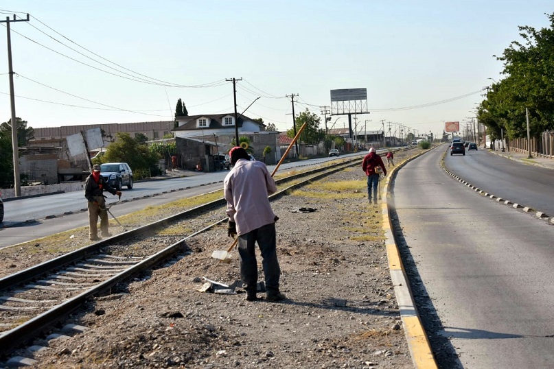 Ciudad Juárez, Chihuahua – Como parte de la jornada de mantenimiento de vialidades en distintos puntos de la ciudad, trabajadores de la Dirección de Parques y Jardines se dedicaron este día a la limpieza general en el camellón central del Eje Vial Juan Gabriel.