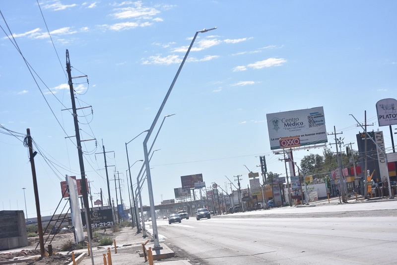 Abraham Espitia, titular de la dependencia, indicó que llevan un avance del 67 por ciento, de lo cual, en el tramo de la Paseo de la Victoria a Francisco Villarreal Torres, ya se cuenta con la instalación total de bases, poliductos, cables y arbotantes, de lo que sigue colocar las luminarias con capacidad de 200 watts.