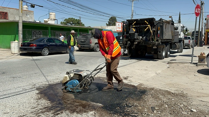 Ciudad Juarez, Chihuahua – Como parte de la atención en las Cruzadas por la Paz en Atención a las Causas, la Dirección General de Obras Públicas complementa labores en beneficio de los residentes de la colonia Zaragoza, llevando su programa de bacheo a las calles de dicho sector.