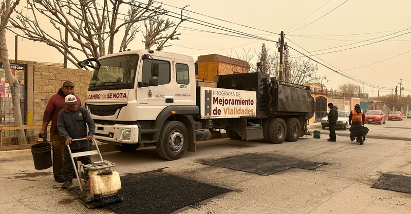 Ciudad Juarez, Chihuahua – Para mejorar las condiciones de las vialidades, la Dirección General de Obras Públicas mantiene trabajos de bacheo en calles en diversos sectores de la ciudad, entre los cuales se encuentra la colonia Kilómetro 20, sector en donde este lunes se encargaron de tapar los hoyos.