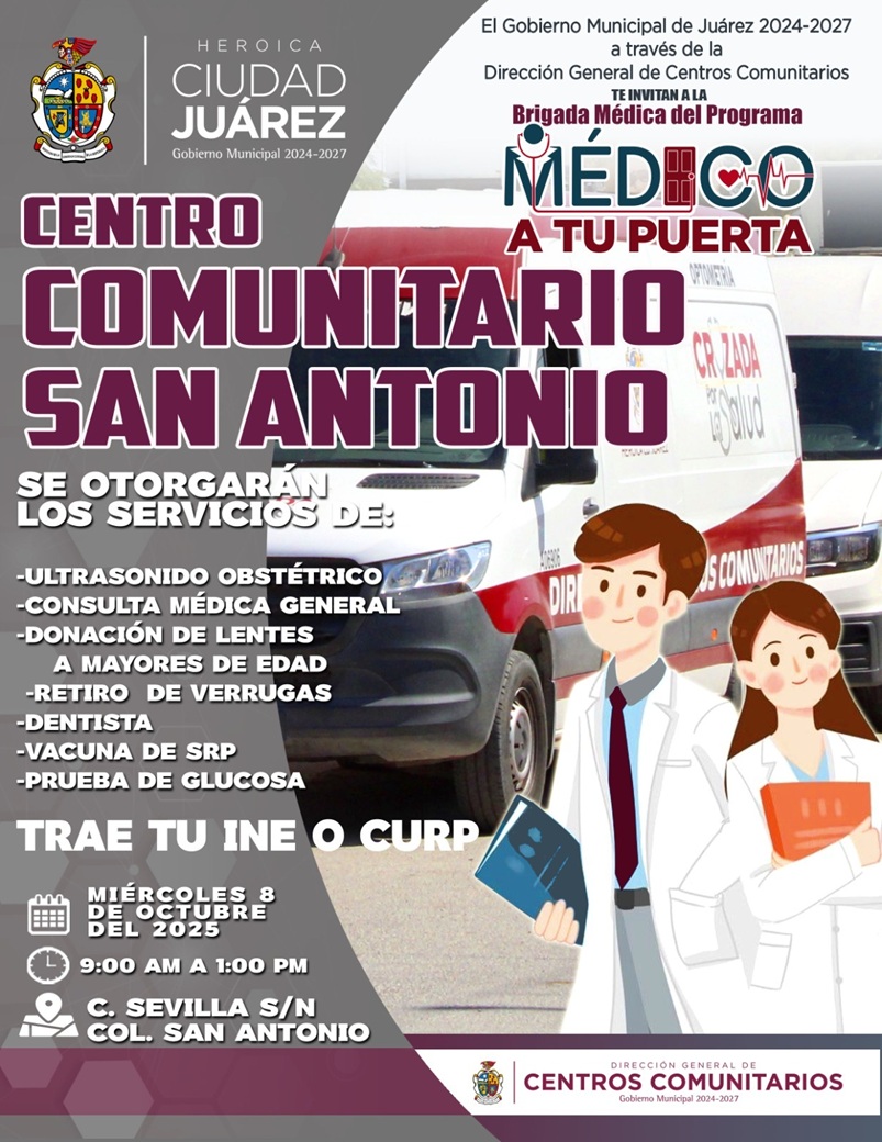 Ciudad Juarez, Chihuahua – La Dirección General de Centros Comunitarios invita a la ciudadanía a la brigada del Programa Médico a Tu Puerta, en la colonia San Antonio.