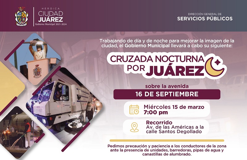 Ciudad Juárez, Chihuahua – La Dirección General de Servicios Públicos llevará a cabo mañana miércoles, a partir de las 7:00 de la tarde, la Cruzada Nocturna en su edición número 33, ahora en la avenida 16 de Septiembre.