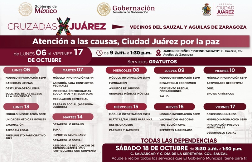 Ciudad Juarez, Chihuahua – El próximo sábado 18 de octubre se llevará a cabo el programa “Cruzadas por Juárez, Atención a las Causas, Ciudad Juárez por la Paz” en la colonia El Sauzal, en la calle Salvarcar y Día de la Secretaría, de 8:30 de la mañana a 1:30 de la tarde.