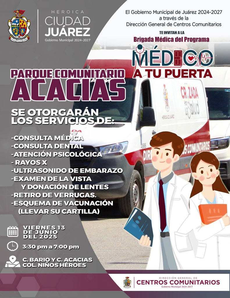 Ciudad Juarez, Chihuahua – El Gobierno Municipal, a través de la Dirección General de Centros Comunitarios, llevará a cabo una brigada del programa Médico a tu Puerta al Parque Comunitario Acacias, ubicado en la calle Bario y Acacias en la colonia Niños Héroes.