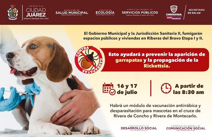 Ciudad Juárez, Chihuahua – Con el objetivo de prevenir la aparición de garrapatas, que son transmisoras del virus de la Rickettsia, el Gobierno Municipal y la Jurisdicción Sanitaria II de la Secretaría de Salud del Estado, llevarán servicios de fumigación gratuita a la zona de Riberas del Bravo etapas I y II.