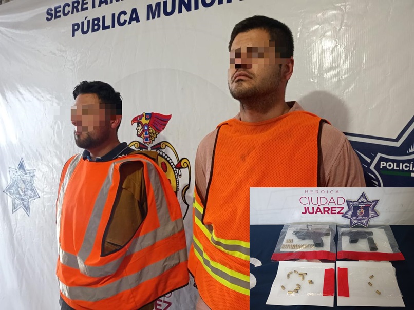 Ciudad Juarez, Chihuahua – Elementos de la Secretaría de Seguridad Pública Municipal arrestaron a Fernando S. L., y Oscar Daniel E. F., por su presunta responsabilidad en la comisión del delito de homicidio y violación a la ley federal de armas de fuego y explosivos.