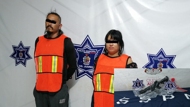 Ciudad Juarez, Chihuahua – Elementos de la Secretaría de Seguridad Pública Municipal adscritos en la Estación de Policía del Riveras, arrestaron a Roberto S. M. y Noreen P. H., por su presunta responsabilidad en la comisión de delitos contra la ley federal de armas de fuego y explosivos y daños a domicilio.
