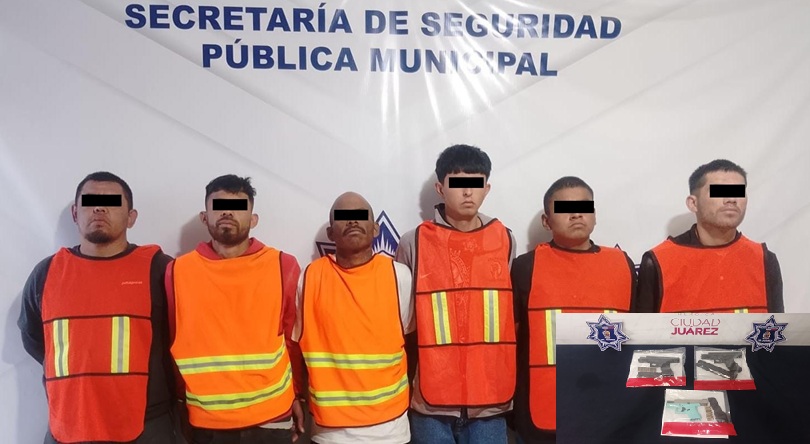 Ciudad Juarez, Chihuahua – Agentes de la Secretaría de Seguridad Pública Municipal detuvieron a Miguel Ángel R. R., Juan Daniel C. D., Edgar Valentín L. C., Juan Guillermo M. A., Yatzeel F. P. y Eduardo Aaron C. C., por su presunta responsabilidad en la comisión del delito de violación a la ley federal de armas de fuego y explosivos, mismos que serán investigados por un homicidio ocurrido en la colonia Granjas Polo Gamboa.