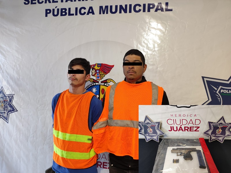 Ciudad Juarez, Chihuahua – Agentes de la Secretaría de Seguridad Pública Municipal arrestaron a Gustavo D. R. y Jesús Tomas C. S., por su presunta responsabilidad en la comisión del delito de privación ilegal de la libertad y delitos contra la ley federal de armas de fuego y explosivos.
