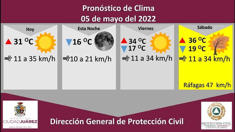 Ciudad Juárez, Chihuahua – La Dirección de Protección Civil municipal, con base en informes del Servicio Meteorológico Nacional, pronostica una temperatura máxima de 31 grados Celsius para este jueves, dio a conocer Roberto Briones Mota, titular de la dependencia.