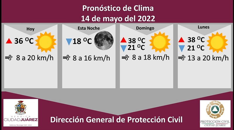 Ciudad Juárez, Chihuahua – La Dirección de Protección Civil municipal, con base en informes del Servicio Meteorológico Nacional, pronostica una temperatura máxima de 36 °C para este sábado, dio a conocer Roberto Briones Mota titular de la dependencia.