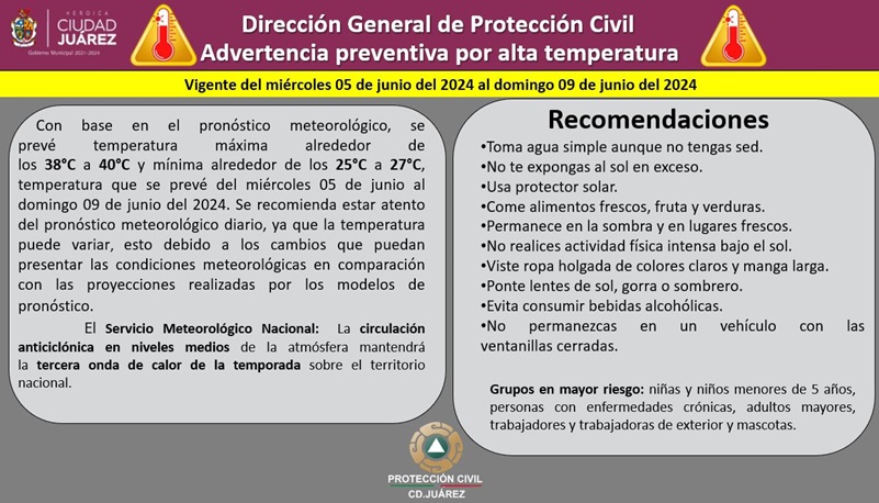 Ciudad Juarez, Chihuahua – La Dirección General de Protección Civil ha emitido una advertencia por altas temperaturas que se registrarán a partir de este miércoles 5 de junio hasta el domingo 9 de junio, ya que se esperan temperaturas que oscilarán entre los 38 y 40 grados Celsius durante este periodo, informó Sergio Rodríguez, titular de la dependencia.