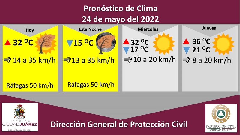 Ciudad Juárez, Chihuahua – La Dirección de Protección Civil municipal, con base en informes del Servicio Meteorológico Nacional, emite una alerta amarilla para este martes debido a fuertes ráfagas de viento que podrían alcanzar los 50 kilómetros por hora, dio a conocer Roberto Briones Mota, titular de la dependencia.