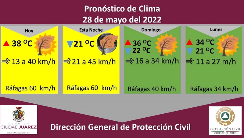 Ciudad Juárez, Chihuahua – La Dirección de Protección Civil, con base en informes del Servicio Meteorológico Nacional, emite una alerta amarilla para este sábado debido a ráfagas de viento que alcanzarán los 60 kilómetros por hora, dio a conocer Roberto Briones Mota, titular de la dependencia.