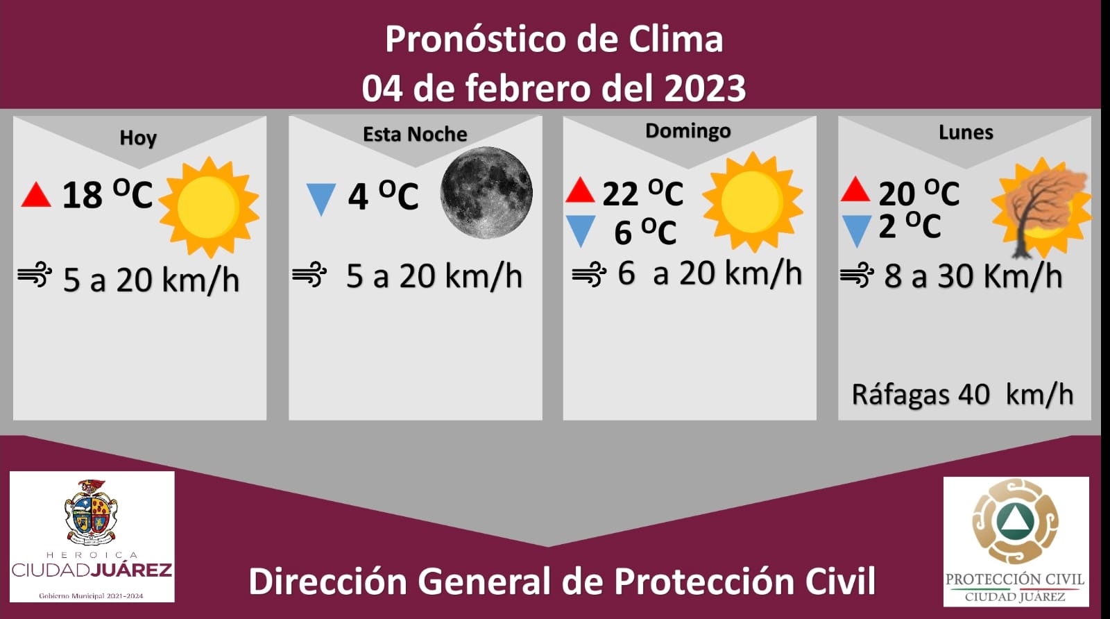 Ciudad Juárez, Chihuahua.- La Dirección General de Protección Civil a través de su Titular Roberto Briones Mota, informó que se pronostica un sábado soleado con una temperatura máxima de 18 grados Celsius.