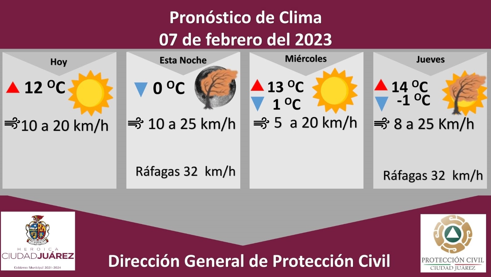 Ciudad Juárez, Chihuahua.- La Dirección General de Protección Civil, con base en informes del Servicio Meteorológico Nacional, pronostica una temperatura máxima alrededor de 12°C y temperatura Mínima alrededor de 0°C, el viento oscilara entre 10 y 25 km/h con la posibilidad de ráfagas de alrededor de 32 km/h.