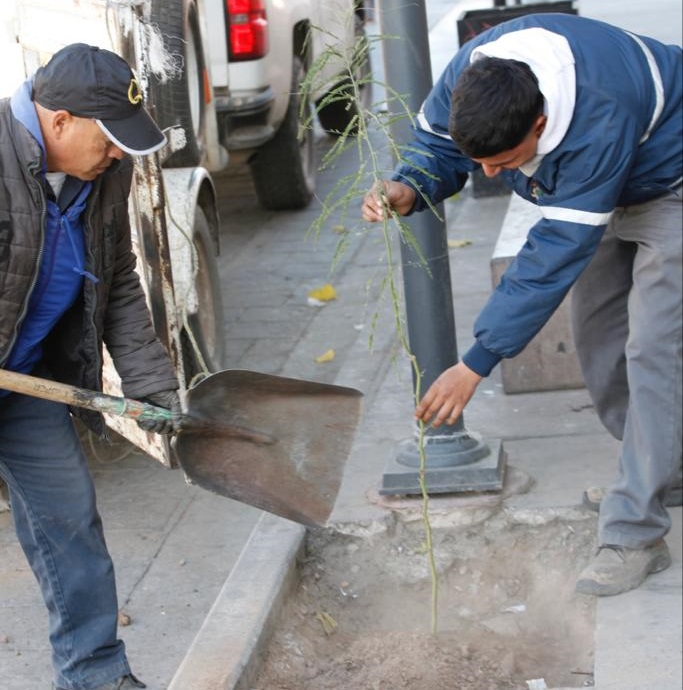 Ciudad Juárez, Chihuahua – Como parte de la campaña de forestación en la ciudad, personal de la Dirección de Parques y Jardines trabaja en la plantación de árboles en la avenida Juárez, en donde empezaron el viernes con 10 de la variedad palo verde.