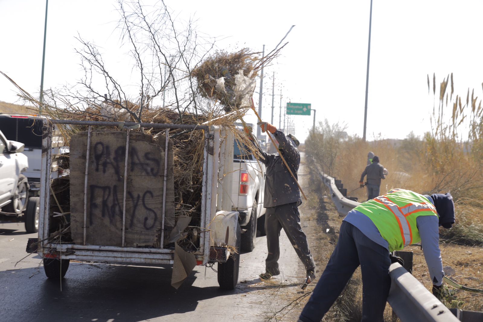 Explicó que hoy se realizan los trabajos en el tramo que comprende de la avenida Francisco Villareal Torres al boulevard Independencia, en donde 10 cuadrillas de Limpia y también de Parques y Jardines se encargan de limpiar de tierra y maleza las colindancias de la avenida y el canal.