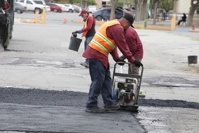 Ciudad Juarez, Chihuahua – Distribuidos en varios grupos, personal de la Dirección General de Obras Públicas trabaja en el bacheo de calles secundarias y principales en diversos sectores de la ciudad, en varios de ellos por reportes que hacen los ciudadanos, dio a conocer Daniel González García, encargado del despacho de la dependencia.
