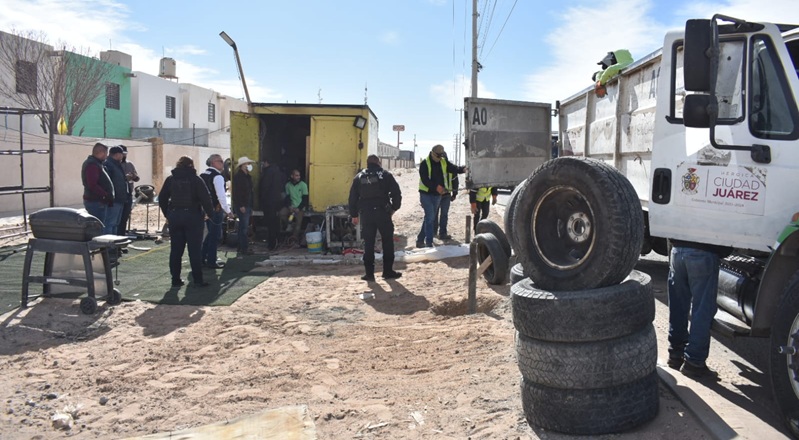 Ciudad Juarez, Chihuahua – En un operativo coordinado, personal de las direcciones de Limpia y Regulación Comercial retiraron una desponchadora que operaba de manera irregular en un predio sobre el bulevar San Isidro, sitio en el que se instaló, luego de que ya lo habían desalojado de otro espacio por el bulevar Manuel Talamás Camandarí.