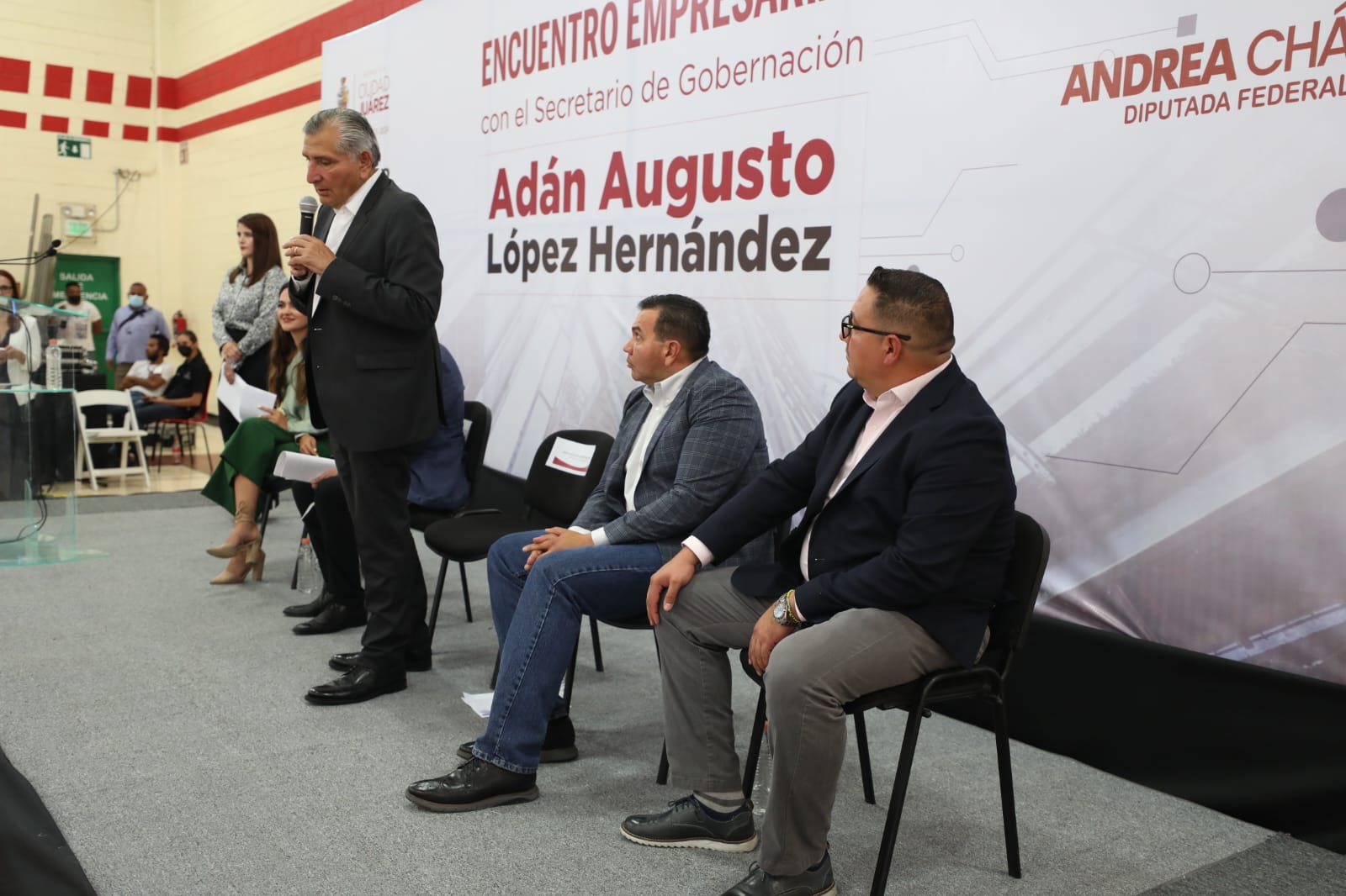 Ciudad Juárez, Chihuahua.- El Secretario de Gobernación, Adán Augusto López Hernández, en su visita a Ciudad Juárez, afirmó que el Gobierno Federal es un aliado de los inversionistas y empresarios de Ciudad Juárez para lograr el desarrollo de esta frontera, durante el “Encuentro Empresarial”, celebrado hoy en el Gimnasio de la empresa Lear del Parque industrial Omega.