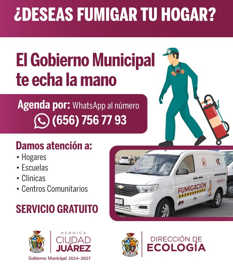 Ciudad Juarez, Chihuahua – La Dirección de Ecología dio a conocer que el servicio de fumigación que ofrece la dependencia es gratuito para toda la ciudadanía, solo se tiene que agendar una cita.