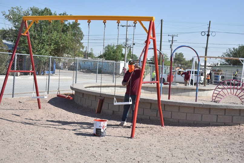 Ciudad Juarez, Chihuahua – Personal de la Dirección General de Servicios Públicos trabaja este martes en la rehabilitación de un parque ubicado sobre el cruce de las calles Manuel Acuña y Campeche en la colonia Salvarcar.