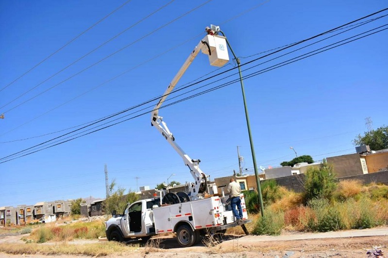 Ciudad Juárez, Chihuahua – Como parte de las acciones para mejorar las condiciones de iluminación en los diferentes sectores de la ciudad, personal de la Dirección de Alumbrado Público trabaja en el fraccionamiento Terranova en la instalación de luminarias.