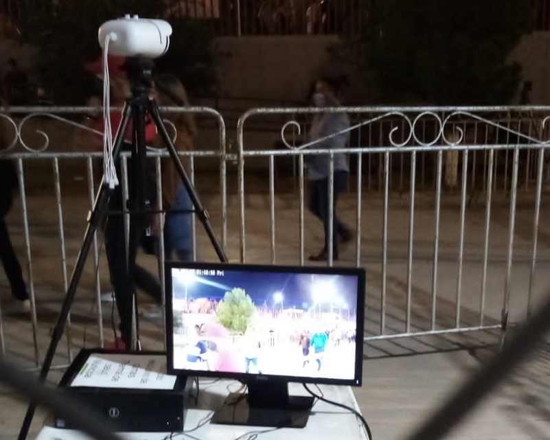 El equipo monitorea la temperatura de los grupos de personas que van ingresando a las instalaciones de la feria y es monitoreada desde una computadora donde alerta cuando alguna persona presenta temperatura corporal alta y es sospechosa de estar contagiada de coronavirus.