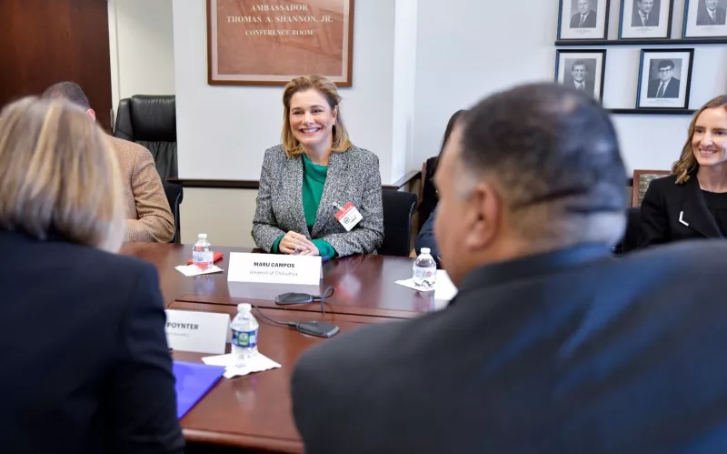 Washington, Estados Unidos.- La Gobernadora del Estado de Chihuahua, María Eugenia Campos Galván, en su gira de trabajo por Washington, sostuvo una reunión con representantes del Departamento de Estado de Estados Unidos, en donde se trataron diversos temas, ente los que destacaron la seguridad pública en la frontera, así como el desarrollo económico de la misma.