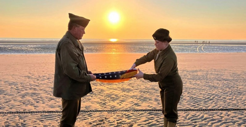 En un lugar tranquilo alejado de las ceremonias oficiales, el francés Christophe Receveur hizo su propio homenaje, extendiendo una bandera estadounidense que compró en un viaje a Pensilvania para rendir homenaje a los caídos el Día D.